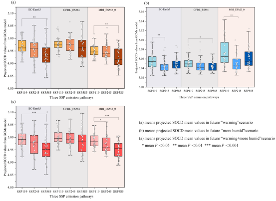 本研究整合了2000-2020年间2883个野外实测土壤剖面样点,结合气候、地形、土壤理化特征、植被及人类活动等多维驱动因子,利用集成机器学习算法(随机森林模型),实现了西南地区1公里空间分辨率的SOCD高精度制图,并在此基础上揭示了SOCD的历史演变、主控因素及未来变化趋势。研究进一步引入CMIP6情景下的气候与二氧化碳浓度预测数据,对2021-2060年不同社会经济路径(SSP1-1.9SSP2-4.5SSP5-8.5)下的碳库变化进行了情景模拟。研究发现:(1)在历史时期(2000s vs. 2010s),中国西南地区的平均SOCD呈现出从C·m-2下降至5.29 kgC·m-2的轻微下降趋势。这种变化在空间上分布不均,约有25%的区域(尤其在云南、重庆和广西部分地区)经历了显著的碳流失。(2)驱动历史SOCD损失的主要因素是环境变化(贡献率-3.48%)和气候变化(贡献率-0.84%)。相比之下,植被绿度的增加对SOCD起到了积极的促进作用(贡献率+0.41%),但在很大程度上被前两者的负面影响所抵消。(3)对未来的预测显示,在所有排放情景下,持续升温将导致SOCD持续流失。虽然降水增加和二氧化碳施肥效应可能会带来一定的碳增汇,但在“升温和增湿”共同作用下,净效应仍然是碳流失。这凸显了控制升温对于保护土壤碳库的紧迫性。