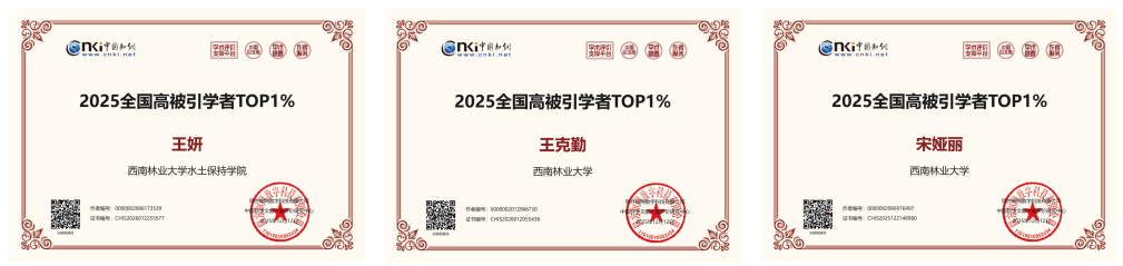 近日,中国知网(CNKI)下属的中国科学文献计量评价研究中心(简称“知网评价中心”)正式发布“2025全国高被引学者”名单。水土保持学院共有10位学者荣耀上榜,彰显了我校在水土保持相关研究领域的深厚积淀与领先地位。其中,王克勤、王妍、宋娅丽3位学者的学术成果影响力尤为显著,入选全国前1%“高被引学者”(即“TOP1%”)。