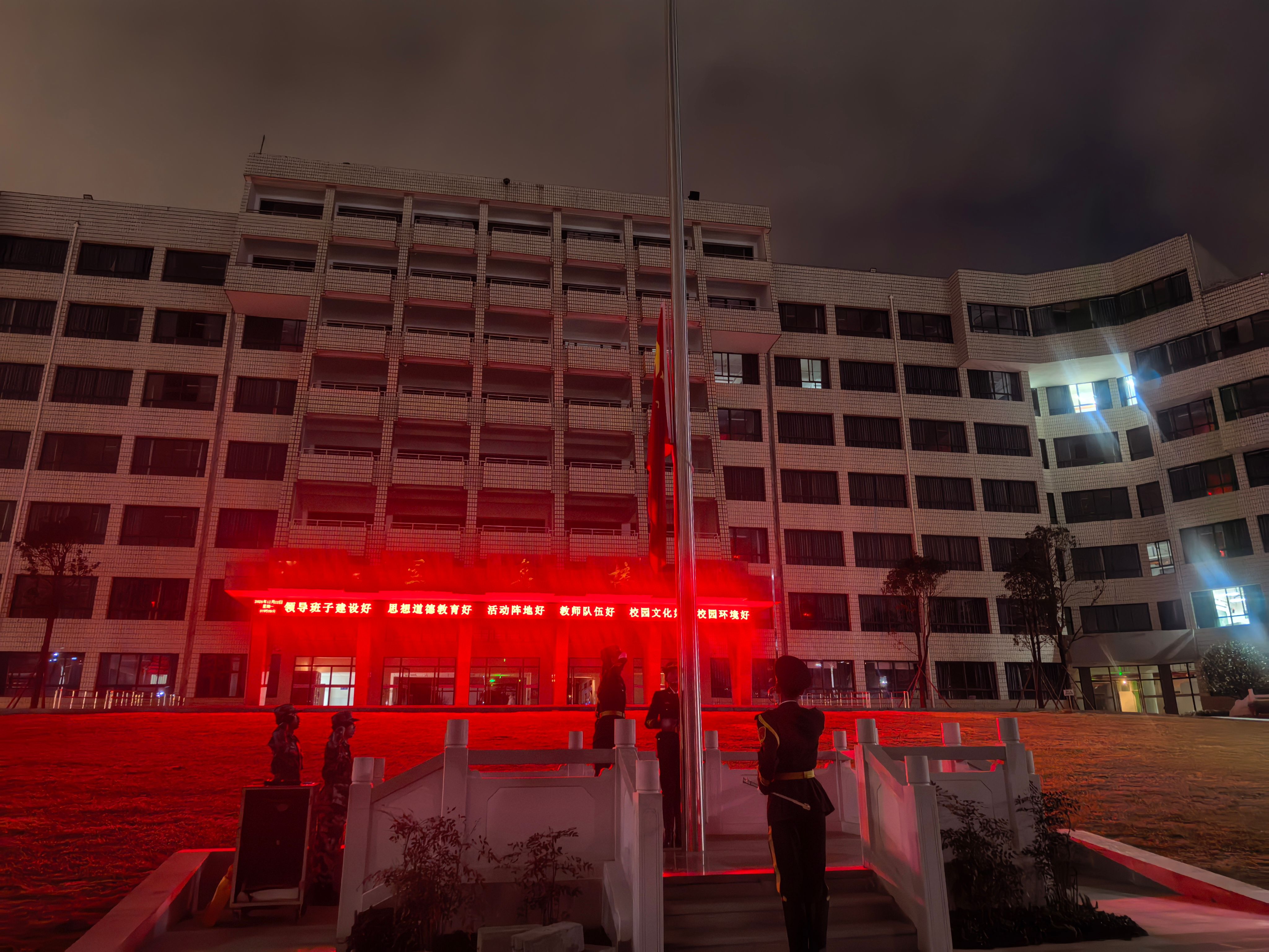 仪式在庄严的氛围中开始。国旗护卫队步伐铿锵,护送国旗入场。随着激昂的《义勇军进行曲》奏响,鲜艳的五星红旗冉冉升起,全体师生肃立行礼,齐声高唱国歌,展现了昂扬的精神风貌。