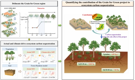 黄土高原是中国“退耕还林还草”工程的核心实施区域。大规模的植被恢复已使该区域从碳源转变为碳汇,但其与同期显著的气候暖湿化趋势交织,使得观测到的碳汇增强中,工程与气候变化的贡献一直模糊不清。这种区分的缺失,制约了对生态效益工程真实效益的准确评估,也影响了面向未来气候变化的适应性管理策略的制定。为此,本研究采用模型模拟与多情景对比的分析方法,旨在精确解析退耕还林还草工程的独立生态效应。论文聚焦两大关键科学问题:第一,如何在空间上精确界定工程实施范围,并定量区分工程与气候变化分别对植被生产力(NPP)和土壤有机碳(SOC)变化的贡献;第二,探讨工程的固碳效应在不同地理分区(如黄土丘陵区、风沙区)以及不同土壤深度上是否存在显著差异。