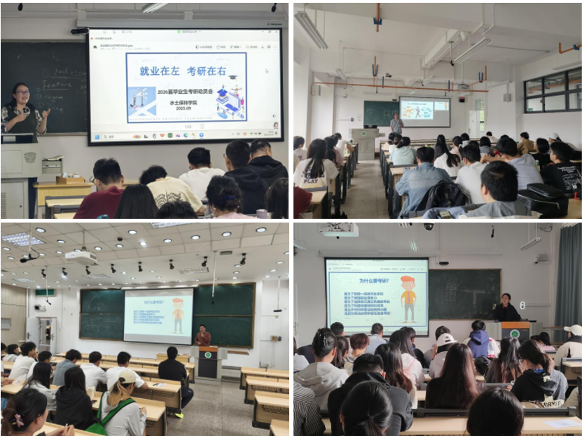 9月24日至29日,水土保持学院陆续召开了6场分专业考研动员会。学院副院长赵洋毅、副院长李伟,地图学与地理信息系统系主任王艳霞,以及班主任程清平、张绍云、苏小娟等教师分别面向水土保持与荒漠化防治、地理科学、地理信息科学、土地资源管理、自然地理与资源环境,以及农业资源与环境专业的2026届毕业生开展考研动员和备考指导。