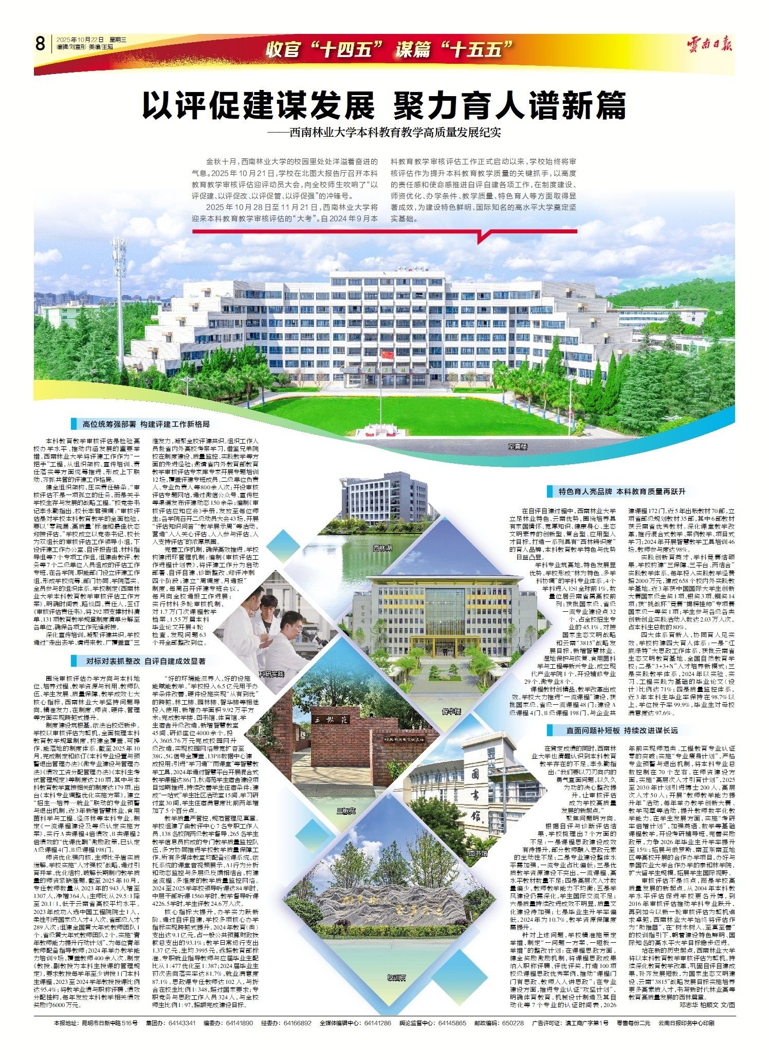 本科教育教学审核评估是检验高校办学水平、推动内涵发展的重要举措。西南林业大学将评建工作作为“一把手”工程,从组织架构、宣传培训、责任落实等方面统筹推进,形成上下联动、齐抓共管的评建工作格局。